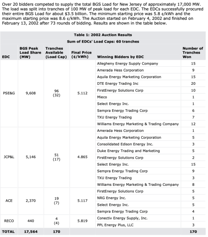 2002年,新澤西州公共事業(yè)委員會(huì)(New Jersey Board of Public Utilities)要求州內(nèi)四家配電公司(PSE&G, JCP&L, ACE, RECO)對(duì)各自配電區(qū)域內(nèi)的用戶提供默認(rèn)供電服務(wù)(basic generation service, BGS)。一方面有鑒于電力改革的先行州加利福利亞州通過公共事業(yè)公司在日前與實(shí)時(shí)市場(chǎng)上自主購買電量所所帶來的一系列問題,另一方面注意到2000年3G頻段拍賣的成功,新澤西州決定嘗試通過多區(qū)域同步降價(jià)時(shí)鐘拍賣(simultaneous descending clock auction,SDCA)方式將四個(gè)配電區(qū)域的12個(gè)月的默認(rèn)負(fù)荷(default load)進(jìn)行全責(zé)(Full Responsibility)外包,以滿足其法定義務(wù),并以招標(biāo)勝出價(jià)為基準(zhǔn),通過系數(shù)調(diào)整確定不同類型電力用戶(如居民與工商業(yè)用戶)在不同時(shí)段(如冬季與夏季)的默認(rèn)供電服務(wù)價(jià)格。