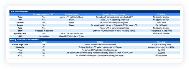 中國磷酸鐵鋰從2021年9月開始超越三元電池,在中國以外,磷酸鐵鋰的使用在逐步加快。因?yàn)?2022-23年左右的專利到期取消,這使得中國以外的使用限制得以打開。鑒于 LFP 的成本優(yōu)勢和車企的材料多樣化激勵措施,現(xiàn)在預(yù)計(jì)磷酸鐵鋰的市場份額將上升到 2030年,從25%提高到2030年的38%。由于磷酸鐵鋰的能量密度較低,大量部署的領(lǐng)域主要包含中小型電動汽車。