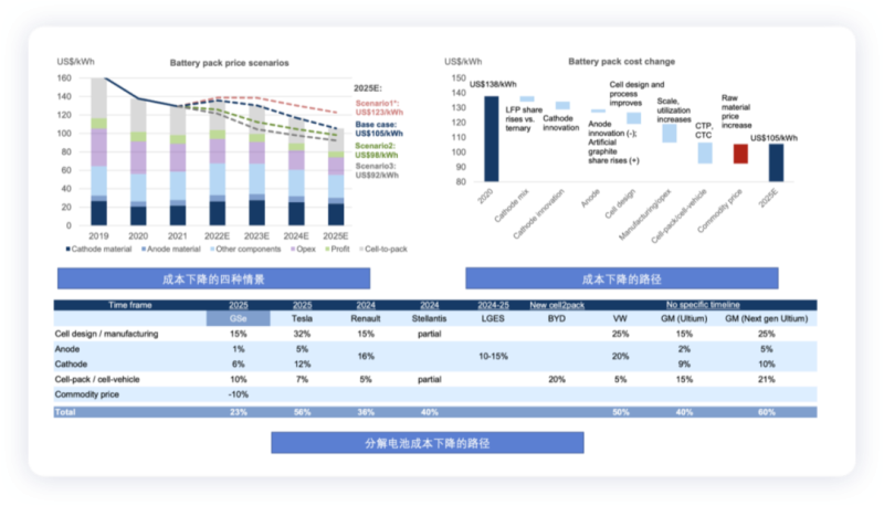 2020-2025年平均電池價格下降32美元/千瓦時(從138美元/千瓦時至105美元/千瓦時),原材料價格變化可能有13-45美元/千瓦時的反彈,電芯成本下降主要來自正極創(chuàng)新和電芯設(shè)計(jì)變化、更好的設(shè)計(jì)(電池到車輛的集成)和產(chǎn)能利用率提高上節(jié)省的運(yùn)營成本。汽車制造商將逐步采用更大的電池。