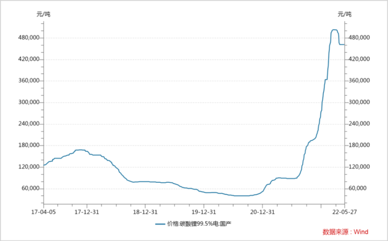 2021年,碳酸鋰漲價(jià)幅度高達(dá)430%以上。進(jìn)入2022年,局面進(jìn)一步失控,碳酸鋰價(jià)格從年初的28萬/噸最高漲至超50萬/元噸,在短短三個(gè)月的時(shí)間里又翻了近乎一倍。