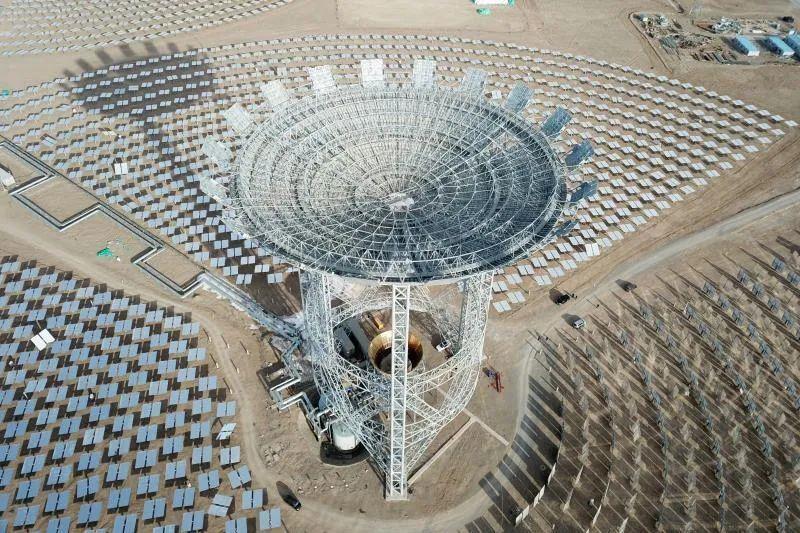 這是首航高科敦煌100兆瓦熔鹽塔式光熱電站,在我國目前建成規(guī)模最大,其吸熱塔最高,可24小時(shí)連續(xù)發(fā)電。