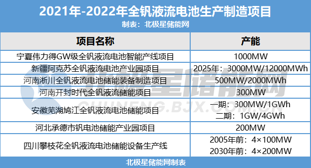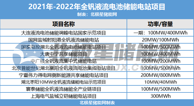 根據(jù)電極活性物質(zhì)的不同,液流電池可分為全釩液流電池、鐵-鉻液流電池、鋅溴液流電池等,其中全釩液流電池發(fā)展最快,商業(yè)化程度最高。其中,全釩液流電池的價格隨著產(chǎn)業(yè)的發(fā)展在不斷變化。在2019年以前,因下游需求小、生產(chǎn)規(guī)模不大、產(chǎn)業(yè)配套不成熟等問題,全釩液流電池單瓦時價格高達4元以上。雖然全釩液流電池曾因造價較高發(fā)展受阻,但是隨著我國對儲能市場的開發(fā)以及釩價格的下降,2021年開始全釩液流電池示范項目集中出現(xiàn)。據(jù)不完全統(tǒng)計,2021年3月至2022年5月,國內(nèi)共有10個正在規(guī)劃或建設的全釩液流電池儲能項目,總規(guī)模約3.74GWh,詳情如下:
