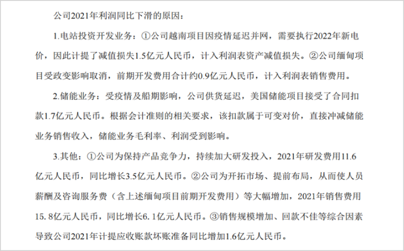 因?yàn)橐咔?,越南?xiàng)目延遲了交付,儲(chǔ)能業(yè)務(wù)也繳納了罰款,同時(shí)還包括緬甸政變不可抗力、匯兌損失、應(yīng)收賬款壞賬準(zhǔn)備、研發(fā)和銷(xiāo)售費(fèi)用大增等。據(jù)財(cái)報(bào)公布后的業(yè)績(jī)說(shuō)明會(huì)顯示,對(duì)凈利潤(rùn)的影響大約有10億元。