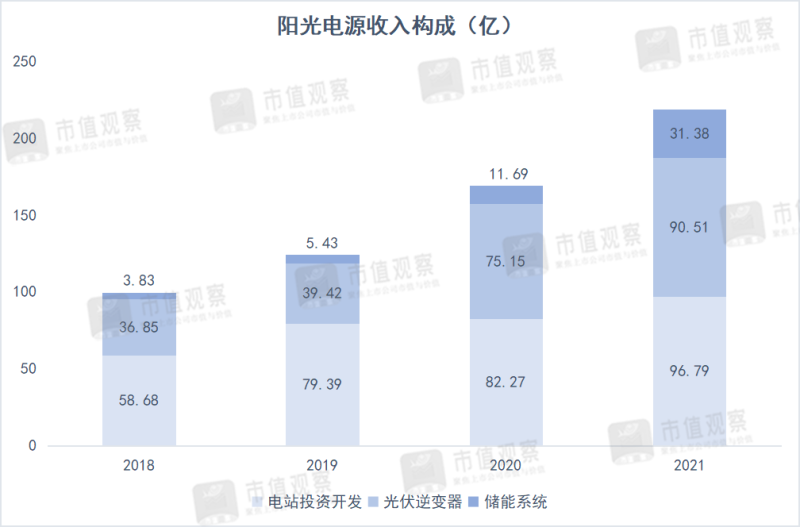 逆變器作為陽(yáng)光電源的核心業(yè)務(wù),當(dāng)前已經(jīng)確立了自身的市場(chǎng)地位,全球市場(chǎng)中形成了雙龍頭格局。2021年市占率超過(guò)30%,超過(guò)華為。
