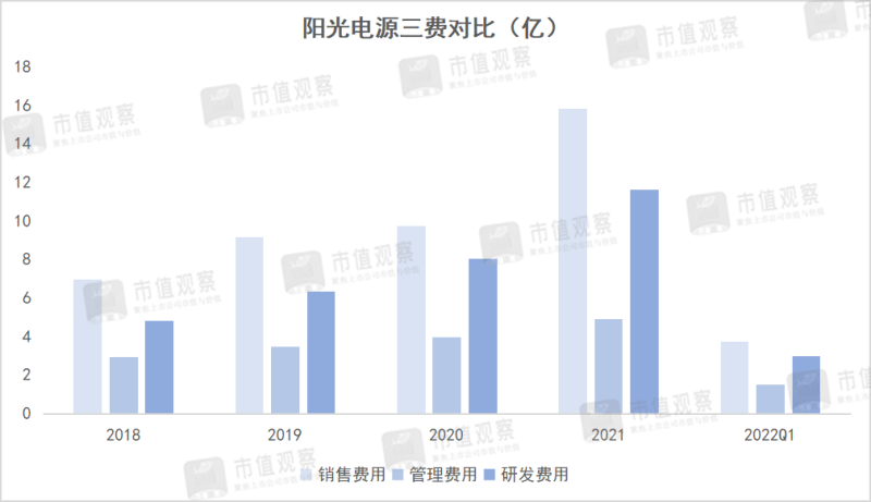步調(diào)太大典型的就是三費(fèi)。數(shù)據(jù)顯示,2021年陽(yáng)光電源全年銷(xiāo)售費(fèi)用達(dá)15.83億,同比增長(zhǎng)62.69%;研發(fā)費(fèi)用為11.61億,同比增長(zhǎng)44%;管理費(fèi)用4.91億,同比23.99%。