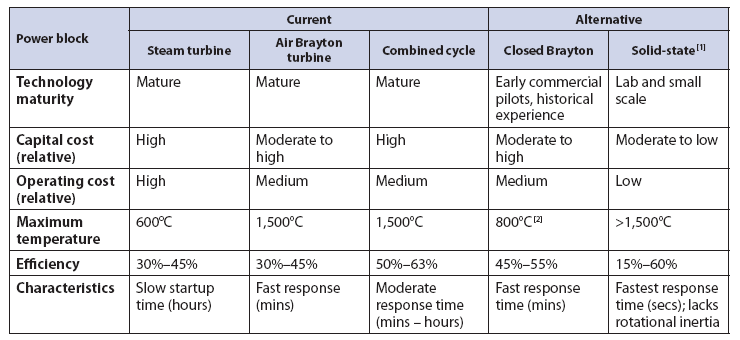 盡管如此,高溫的一個原因是為了實現(xiàn)更高的輻射傳熱率,這對于一些固態(tài)能量轉(zhuǎn)換設(shè)備來說是至關(guān)重要的。除了效率之外,關(guān)鍵指標是成本、靈活性和技術(shù)準備情況。靈活性包括啟動時間和成本、斜坡率、最小負載和部分負載效率。出于這項研究的目的,假設(shè)未來的熱儲能系統(tǒng)(2050 年時間框架)將足夠靈活,保證在建模分析中排除這些考慮因素。靈活性的價值取決于存儲設(shè)備邊界之外的因素。表 4.1 比較了目前占主導(dǎo)地位的熱電轉(zhuǎn)換技術(shù)和處于不同發(fā)展階段的替代方案。