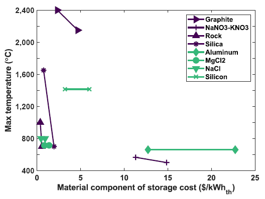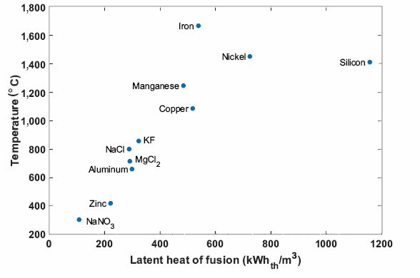 溫度-效率關(guān)系通常排除一些溫度不能超過400℃的材料。這些材料可能仍可用于發(fā)電以外的應(yīng)用。因此,基于材料的能源成本的考慮可以快速過濾掉不相容的選擇。每單位熱能的材料成本可以通過幾個變量來估計。對于顯熱,變量是單位質(zhì)量成本、比熱容和溫度變化。對于儲存潛熱,其變量是單位質(zhì)量成本和熔化潛熱;熔化潛熱是與固體和液體之間的相變相關(guān)的能量。