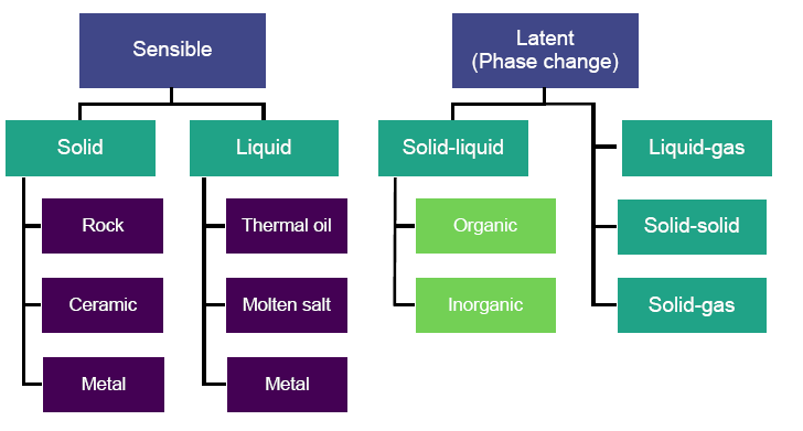 除了根據(jù)材料使用的儲熱機制(即顯熱與潛熱)對材料進行分組外,材料還可以根據(jù)其熱量和機械性能以及其他特性(例如毒性和與容器材料的反應(yīng)性)進行分類。雖然在選擇存儲材料方面具有靈活性,但這種設(shè)計選擇涉及權(quán)衡影響系統(tǒng)其余部分的能力,即實現(xiàn)較低的單位能源成本和可接受的效率和放電功率成本。