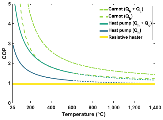 電阻加熱器可以將電能轉(zhuǎn)化為熱能,COP超過90%,但其COP不能超過100%。電阻加熱器可以直接放置在儲能材料中,內(nèi)置在管道中,或放置在容器或管道附近進行間接加熱。感應(yīng)加熱使用振蕩磁場在儲能材料或中間傳熱流體內(nèi)產(chǎn)生熱量。感應(yīng)加熱相比間接電阻加熱可以克服一些傳熱阻力;然而,感應(yīng)加熱設(shè)備更昂貴,并且不適用于所有材料。