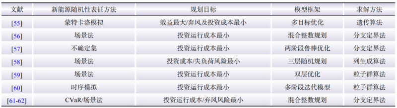 大規(guī)模儲(chǔ)能源側(cè)/網(wǎng)側(cè)規(guī)劃是在現(xiàn)有既定電源、網(wǎng)架以及其他系統(tǒng)設(shè)備的配置條件下,綜合考慮各類電源的分布及相關(guān)特性,尋找可行乃至最優(yōu)的儲(chǔ)能電站投建地點(diǎn),投建類型及投建容量。表1給出了儲(chǔ)能規(guī)劃研究總結(jié)和對(duì)比。在新能源隨機(jī)性的刻畫方面,文獻(xiàn)多是采用了基于場景的隨機(jī)表征方法或基于不確定集的魯棒表征方法;規(guī)劃目標(biāo)主要是投資的經(jīng)濟(jì)性,兼顧了新能源消納、供能可靠性、電壓穩(wěn)定及線路阻塞緩解等需求,最終基于多階段分層/最優(yōu)潮流優(yōu)化理論構(gòu)建了儲(chǔ)能選址定容優(yōu)化問題。