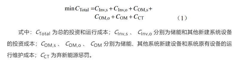 (2)儲(chǔ)能設(shè)備可以持續(xù)存儲(chǔ)電量,可以實(shí)現(xiàn)一定程度上的“套利”,即將發(fā)電成本低時(shí)段的電量轉(zhuǎn)到發(fā)電成本高的時(shí)段。從這個(gè)角度分析,規(guī)劃建設(shè)的儲(chǔ)能可以在一定程度上減少運(yùn)行費(fèi)用。因此,可以在目標(biāo)函數(shù)中綜合考慮投資和運(yùn)行成本,以選取相應(yīng)的最優(yōu)方案實(shí)現(xiàn)成本的進(jìn)一步降低。此時(shí)投資決策和運(yùn)行優(yōu)化耦合關(guān)系會(huì)愈發(fā)緊密,使模型問題進(jìn)一步復(fù)雜化。