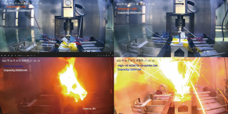 恩力針刺試驗(yàn)過(guò)程截圖(上面兩張圖為恩力動(dòng)力鋰金屬電池,下面兩張為市售三元鋰離子電池)