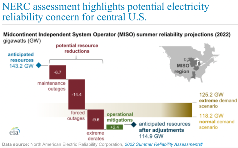 中國儲(chǔ)能網(wǎng)訊:據(jù)美國能源信息署的報(bào)告,預(yù)計(jì)今年夏天電力需求攀升而潛在的供應(yīng)減少,引發(fā)了對(duì)美國今年夏天“中州獨(dú)立系統(tǒng)運(yùn)營商”(MISO)區(qū)域的電力平衡的擔(dān)憂。