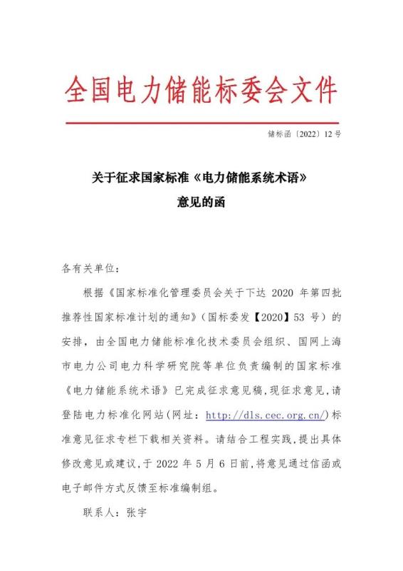 關(guān)于征求國家標(biāo)準(zhǔn)《電力儲能系統(tǒng)術(shù)語》意見的函
