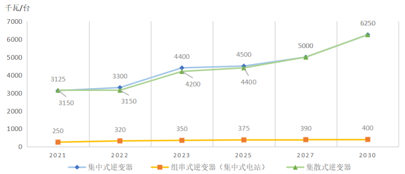 圖14 2021-2030年我國(guó)逆變器單機(jī)主流額定功率增長(zhǎng)趨勢(shì)