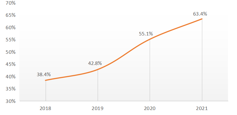 雙面(雙玻),指對(duì)電池板進(jìn)行封裝時(shí),將傳統(tǒng)背板替換成玻璃或透明背板,使電池板背面也能吸收地面反射光及空氣中的散射光以提高電池轉(zhuǎn)換功率,進(jìn)而降低光伏項(xiàng)目度電成本。在不同場(chǎng)景下,雙面組件的發(fā)電效率比傳統(tǒng)單面組件高5%~19%。截至2021年,我國(guó)雙面組件市場(chǎng)份額為37.4%,同比提升7.7個(gè)百分點(diǎn)。據(jù)業(yè)內(nèi)估算,到2023年,雙面組件市場(chǎng)占比有望與傳統(tǒng)單面組件達(dá)到同一水平。