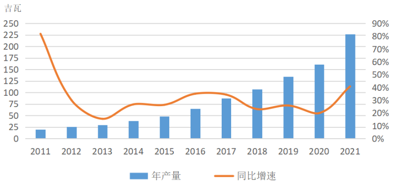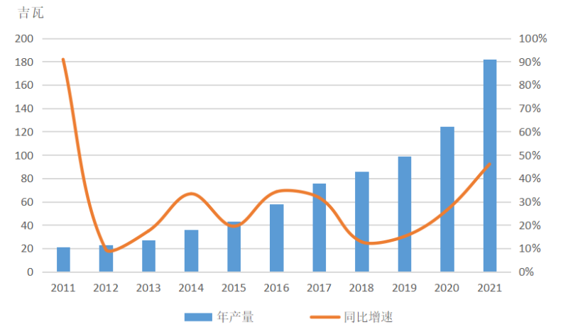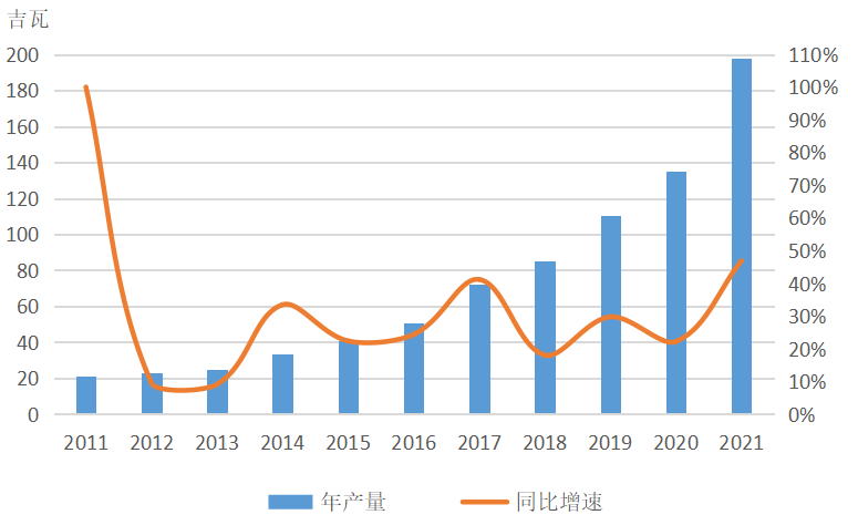 圖12 2011-2021年我國(guó)光伏組件年產(chǎn)量變化