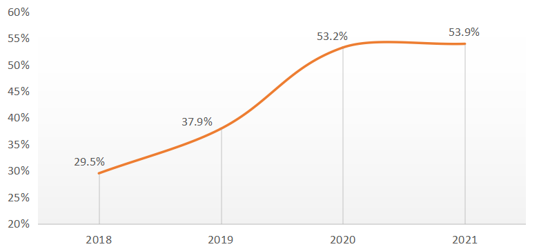 膠膜是光伏組件封裝過程的重要材料,其透光性、粘結(jié)強(qiáng)度、耐老化等特性對(duì)于組件的密封性和使用壽命具有重要影響。截至2021年,我國(guó)光伏膠膜領(lǐng)域TOP4的全球市場(chǎng)份額占比合計(jì)超過83%,占據(jù)絕對(duì)主導(dǎo)地位。當(dāng)前,光伏膠膜主要分為EVA膠膜(包括透明EVA膠膜和白色EVA膠膜)、POE膠膜和EPE膠膜(EVA與POE混合)等類型。據(jù)統(tǒng)計(jì),截至2021年底,透明EVA的國(guó)內(nèi)市場(chǎng)份額達(dá)51.8%,白色EVA膠膜國(guó)內(nèi)占比約為23.1%,POE膠膜國(guó)內(nèi)占比約達(dá)23.2%。受不斷增長(zhǎng)的高效電池市場(chǎng)需求驅(qū)動(dòng),具有更高透光性的白色EVA膠膜、抗PID[2]性能更好的POE膠膜等高品質(zhì)膠膜的市場(chǎng)占比有望進(jìn)一步提升。