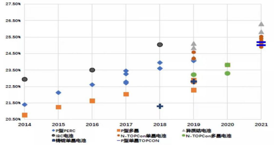 PERC電池生產(chǎn)工藝相對(duì)成熟,從2018年起一直在我國(guó)新增產(chǎn)能中占據(jù)主要位置,是現(xiàn)行階段的光伏電池主流類型。數(shù)據(jù)顯示,截至2021年底,PERC電池的量產(chǎn)轉(zhuǎn)換效率達(dá)到23.1%,較2020年提高0.3個(gè)百分點(diǎn),逼近其24.5%的效率理論極限。為提升PERC電池轉(zhuǎn)換效率,業(yè)內(nèi)在PERC基礎(chǔ)上對(duì)技術(shù)進(jìn)一步升級(jí),使轉(zhuǎn)換效率極限實(shí)現(xiàn)0.2%~0.3%的提升,其產(chǎn)品被業(yè)內(nèi)稱為PERC+。