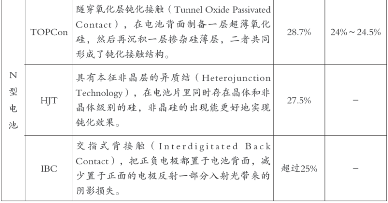 N型電池的制備技術(shù)相對(duì)復(fù)雜,量產(chǎn)工藝尚未完全成熟,包含TOPCon、HJT、IBC等多種類型,發(fā)展前景被業(yè)內(nèi)看好。當(dāng)前,TOPCon和HJT主要處于小試、中試階段,IBC尚無法實(shí)現(xiàn)量產(chǎn)。當(dāng)前,N型電池的轉(zhuǎn)換效率已基本超過PERC轉(zhuǎn)換效率的理論極限,且技術(shù)革新仍處于密集活躍期,被視為光伏電池技術(shù)下一階段的主要發(fā)展方向。據(jù)CPIA預(yù)測(cè),2022年底,N型電池(TOPCon和HJT)的市場(chǎng)占比有望從3%提升至13.4%。