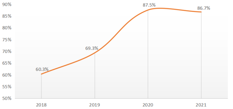 在供給端,我國(guó)多晶硅產(chǎn)業(yè)發(fā)展步伐不斷提速,已成長(zhǎng)為全球最大多晶硅生產(chǎn)基地。據(jù)統(tǒng)計(jì),2021年,我國(guó)多晶硅實(shí)現(xiàn)年產(chǎn)量50.5萬噸,同比增長(zhǎng)27.5%,約占全球總產(chǎn)量的80%。產(chǎn)量增長(zhǎng)主要有兩方面原因。一是我國(guó)硅資源儲(chǔ)量較為豐富。目前,我國(guó)保有儲(chǔ)存硅石礦150處左右,其中以西北地區(qū)最為富足,共計(jì)保有礦石儲(chǔ)量19.1億噸,占全國(guó)保有礦石儲(chǔ)量的48%,利用率為7%。二是我國(guó)多晶硅自給能力持續(xù)提升。數(shù)據(jù)顯示,國(guó)內(nèi)多晶硅自給率從2010年的47.8%持續(xù)提升至2019年的75.4%,對(duì)外依存度大幅降低。