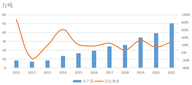 圖2 2011-2021年我國(guó)多晶硅年產(chǎn)量變化