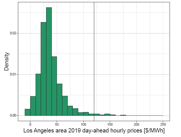 在上一節(jié)中考慮的三種發(fā)電技術(shù)中,在模擬的所有案例中,聯(lián)合循環(huán)發(fā)電廠產(chǎn)生的氫基電力成本最低。值得注意的是,在“現(xiàn)實(shí)”的未來案例中,該技術(shù)實(shí)現(xiàn)的氫氣最低成本為1美元/kg和30%的產(chǎn)能系數(shù),約為120美元/MWh。圖5.16顯示了2019年洛杉磯地區(qū)的一天每小時電價的直方圖;垂直線表示每小時120美元/MWh價格。