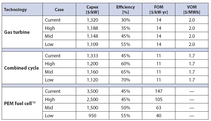 與研究團(tuán)隊(duì)估算上游制氫成本的方法類似,建立了一個自下而上的模型來評估使用氫氣發(fā)電的成本。為此考慮三種發(fā)電技術(shù):燃?xì)廨啓C(jī)、聯(lián)合循環(huán)燃?xì)廨啓C(jī)和大型固定式燃料電池。