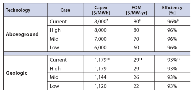 如上所述,氫氣可以作為壓縮氣體或液體儲存在地上儲罐中;或者可以作為氣體儲存在地下地質(zhì)儲存設(shè)施中。為了在建模分析中量化氫價值鏈的存儲元素,研究團(tuán)隊(duì)估計了與建造氫氣存儲資產(chǎn)相關(guān)的資本成本、與運(yùn)營這些資產(chǎn)相關(guān)的固定運(yùn)營和維護(hù)成本以及資產(chǎn)的效率。資本成本按每單位存儲成本計量;出于建模的目的,使用美元/MWh來衡量儲存的氫氣的價值。1MWh的氫氣大約相當(dāng)于30kg的氫氣。研究團(tuán)隊(duì)使用能量單元進(jìn)行儲氫,以便與其他儲能技術(shù)進(jìn)行比較。假設(shè)年度固定運(yùn)營和維護(hù)成本是資本成本的一部分。其效率以百分比形式;它說明了在儲存之前壓縮氫氣所需的能量。例如,93%的效率意味著在調(diào)節(jié)氫氣以進(jìn)行儲存的過程中消耗了相當(dāng)于原始?xì)錃饬恐?%的能量含量。表5.4顯示了用于估算儲氫成本的每個關(guān)鍵指標(biāo)的2020年和2050年假設(shè)。