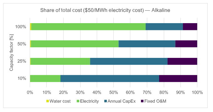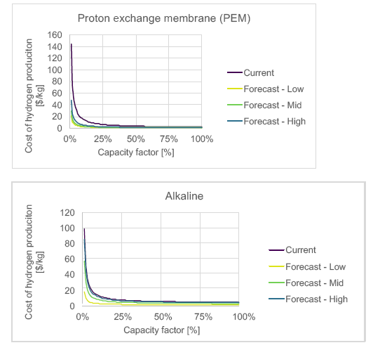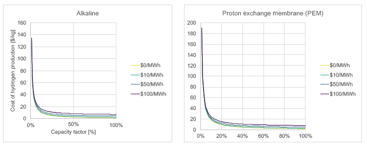 使用這些假設(shè),該模型解決了在一系列電力成本和工廠產(chǎn)能因素(其中產(chǎn)能因素是工廠利用率的衡量標(biāo)準(zhǔn),通常計算為實(shí)際輸出與最大輸出的比率)下生產(chǎn)氫氣的成本。結(jié)果如圖5.9所示。