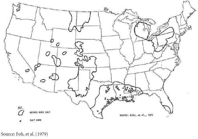 地下儲氫或地質(zhì)儲氫是一項(xiàng)商業(yè)上可行的技術(shù),已經(jīng)大規(guī)模部署——事實(shí)上,氫氣目前儲存在世界各地許多地方的地下鹽洞中。地下儲存設(shè)施比地上設(shè)施大得多,并且能夠以能源為基礎(chǔ)儲存更多數(shù)量級的氫氣。然而,地下儲存需要合適的地質(zhì)條件,并且可以開采的鹽穴位置有限。圖5.4顯示了美國的鹽床和鹽丘。