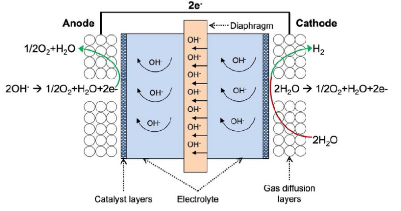 堿性電解槽是兩種主要低溫電解技術(shù)中較為成熟的一種。這些系統(tǒng)由陽極和陰極組成,根據(jù)以下反應(yīng):