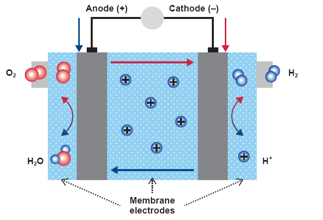 與堿性電解槽一樣,PEM電解槽通過使用陽極和陰極將水分解為其組成元素來生產(chǎn)氫氣。然而,在PEM電解槽中,陽極和陰極在堿性溶液中被聚合物膜隔開(相比之下,只有帶正電的氫分子被允許從陽極移動到陰極)。圖5.2說明了PEM電解槽的內(nèi)部操作。