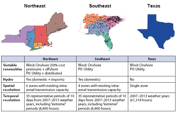 正如研究團(tuán)隊(duì)將在后面的部分中看到的那樣,可調(diào)度的低碳資源的可用性以及太陽能和風(fēng)力發(fā)電的資源質(zhì)量對(duì)模擬系統(tǒng)成本和最佳儲(chǔ)能量具有重要意義。三個(gè)建模區(qū)域之間的差異以及這些區(qū)域與美國(guó)其他地區(qū)之間的明顯差異(即美國(guó)西南地區(qū)的優(yōu)質(zhì)太陽能和西北地區(qū)的廣泛水電)意味著沒有可靠的方法來概括或匯總研究團(tuán)隊(duì)的區(qū)域結(jié)果編制美國(guó)的整體情況。