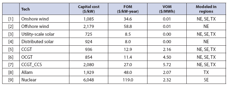根據(jù)研究團(tuán)隊(duì)的建模假設(shè),將投資限制在以下技術(shù):公用事業(yè)規(guī)模的太陽能發(fā)電設(shè)施和陸上風(fēng)電設(shè)施(以及美國(guó)東北部的海上風(fēng)電和分布式太陽能設(shè)施);天然氣發(fā)電廠(開式循環(huán)燃?xì)廨啓C(jī)(OCGT)和聯(lián)合循環(huán)燃?xì)廨啓C(jī)(CCGT));采用或不采用基于胺的碳捕獲和儲(chǔ)存(CCS)技術(shù);發(fā)揮重要作用的水電設(shè)施(美國(guó)東北部和東南部)。研究團(tuán)隊(duì)并不認(rèn)為燃煤發(fā)電在2050年在美國(guó)是一種可行的發(fā)電技術(shù),這是因?yàn)槿济喊l(fā)電的成本競(jìng)爭(zhēng)力下降,在美國(guó)電力結(jié)構(gòu)中的作用逐漸減弱,并且具有更高的碳排放。新建模型的例外是美國(guó)東北部和東南部現(xiàn)有的水電設(shè)施和抽水蓄能發(fā)電設(shè)施,美國(guó)東南部現(xiàn)有的核電設(shè)施在2050年仍可運(yùn)行,假設(shè)其工作壽命為80年,以及美國(guó)東北部和東南部現(xiàn)有輸電能力。如下所述,將德克薩斯州建模為單個(gè)輸電區(qū)域。在獨(dú)立的區(qū)域案例研究中,還評(píng)估了新的核能和新興天然氣發(fā)電技術(shù)與碳捕獲和儲(chǔ)存(CCS)技術(shù)和工業(yè)用氫的影響。