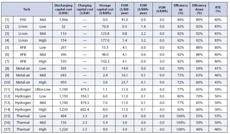 在GenX模型中,根據(jù)儲(chǔ)能技術(shù)的設(shè)計(jì)以及假定的成本和性能特征進(jìn)行區(qū)分。在設(shè)計(jì)方面,GenX包含兩種廣泛的儲(chǔ)能技術(shù)。第一類包括充電和放電容量相等的技術(shù)(例如鋰離子電池或液流電池、抽水蓄能);對(duì)于這些技術(shù),儲(chǔ)能容量和充電/放電裝機(jī)容量是兩個(gè)獨(dú)立的設(shè)計(jì)變量,并且可以指定儲(chǔ)能容量與裝機(jī)容量的可行范圍。第二類包括充電功率和放電功率的技術(shù),以及儲(chǔ)能容量,這些都是獨(dú)立的設(shè)計(jì)變量(例如熱儲(chǔ)能或氫氣儲(chǔ)能)。根據(jù)這一分類,儲(chǔ)能技術(shù)的特征在于一個(gè)、兩個(gè)或三個(gè)獨(dú)立的資本和固定運(yùn)營(yíng)和維護(hù)成本參數(shù)(表6.2)。對(duì)于儲(chǔ)能容量是獨(dú)立設(shè)計(jì)變量的儲(chǔ)能技術(shù),研究團(tuán)隊(duì)將持續(xù)時(shí)間(儲(chǔ)能容量與裝機(jī)容量之比)限制為小于300小時(shí),但這一限制不會(huì)對(duì)此處報(bào)告的結(jié)果具有約束力。此外,由于數(shù)據(jù)限制,對(duì)具有固定儲(chǔ)能時(shí)間(12小時(shí))的抽水蓄能進(jìn)行建模,并假設(shè)總資本成本僅與電力容量成比例。