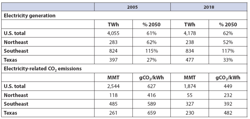 具體來說,研究團(tuán)隊(duì)分析了美國(guó)三個(gè)地區(qū)(美國(guó)東北部、東南部和德克薩斯州)以及國(guó)家層面的電力系統(tǒng)的演變,但細(xì)節(jié)較少。在2005年至2018年期間,所有這些地區(qū)以及美國(guó)各地都經(jīng)歷了發(fā)電產(chǎn)生的碳排放量顯著減少。這些減少反映了電力需求停滯的綜合影響;大量減少燃煤發(fā)電轉(zhuǎn)而使用天然氣發(fā)電,主要是出于經(jīng)濟(jì)原因;可變可再生能源 (VRE)發(fā)電量顯著增加,主要是(但不完全)由公共政策推動(dòng)。盡管有這些趨勢(shì),化石燃料發(fā)電設(shè)施仍然是美國(guó)能源相關(guān)碳排放的主要來源,約占2018年美國(guó)能源相關(guān)碳排放總量的31%。