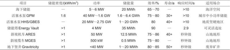 表1對以上幾種重力儲能技術(shù)進行了比較。從表中可以看出,水介質(zhì)型重力儲能系統(tǒng)在功率和儲能容量方面不及傳統(tǒng)的抽水蓄能,但響應(yīng)時間短、選址更靈活,海下儲能系統(tǒng)可以合理利用海洋空間,活塞水泵系統(tǒng)可以為城市提供儲能服務(wù),儲能成本和效率也與抽水蓄能相當(dāng)。固體重物型重力儲能系統(tǒng)的儲能容量和功率由大到小排為:基于山體落差系統(tǒng)>基于地下豎井系統(tǒng)>基于構(gòu)筑物系統(tǒng)。固體重物型儲能系統(tǒng)由于不需要水泵、水輪機結(jié)構(gòu),理論上可以實現(xiàn)比抽水蓄能更高的儲能效率,響應(yīng)時間也更短,可以根據(jù)不同地形和需求靈活選擇不同儲能結(jié)構(gòu)。