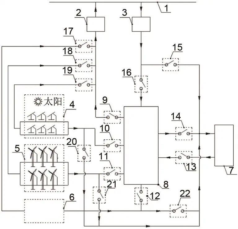 重力勢能儲能還可與其他儲能系統(tǒng)結(jié)合形成一種綜合式的儲能系統(tǒng)。華能集團2020年提出了一種重力壓縮空氣儲能系統(tǒng)(圖14),兼具了壓縮空氣儲能能量密度高和重力儲能布置靈活的優(yōu)點。西安熱工研究院2021年提出了一種新能源發(fā)電結(jié)合電池及重力儲能的系統(tǒng)(圖15),新能源可直接充電至重力儲能系統(tǒng)減小電力傳輸損耗,避免了單個重力儲能模塊的頻繁啟停對系統(tǒng)運行的影響。