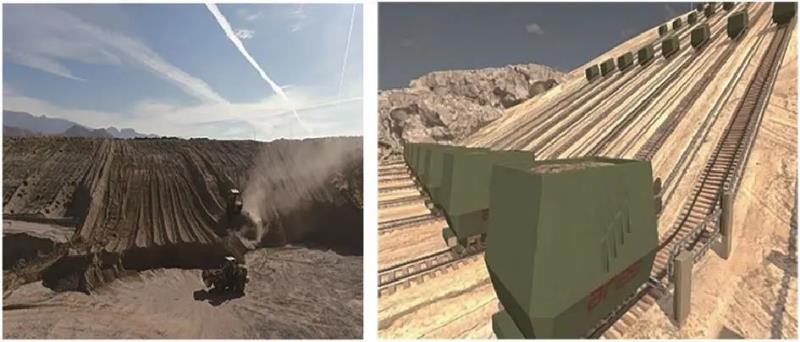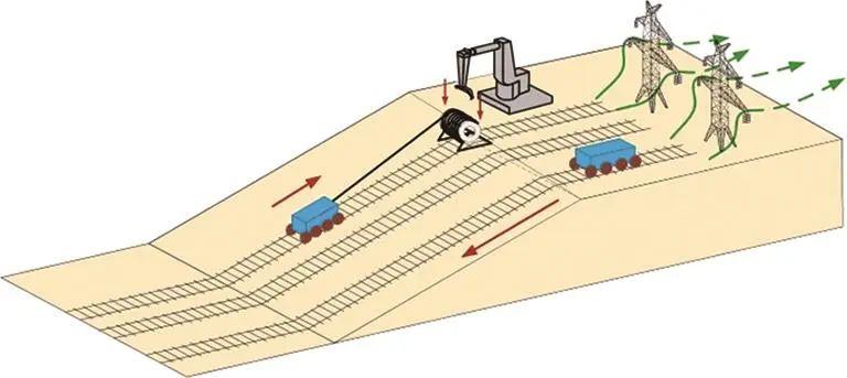 美國ARES公司(Advanced Rail Energy Storage)2014年提出一種機車斜坡軌道系統(tǒng),機車在軌道上上坡下坡進行儲能和釋能(圖8),2020年在內(nèi)華達州開始施工建設(shè)。該技術(shù)已在加州特哈查皮的一個試點項目中測試成功,其首個商業(yè)部署正在內(nèi)華達州帕倫普市開發(fā),并將與加州電網(wǎng)連接。這個儲存系統(tǒng)將使用一個由210輛貨車組成的車隊,總重7.5萬噸,在10條長度9.3 km、平均坡度7%的軌道上,電動機帶動鏈條將這些貨車拖到山頂。當(dāng)需要電力時,車輛被送回山下,當(dāng)它們下落時,鏈條帶動發(fā)電機發(fā)電。ARES宣稱,這座儲能系統(tǒng)可以提供持續(xù)15 min 50 MW的電力,效率可達75%~86%。這種儲能系統(tǒng)利用了山地地形和軌道車輛,可以實現(xiàn)室外環(huán)境下大容量儲能,但平整山坡的土建成本較高,鏈條傳動平穩(wěn)性差易磨損,還需要進一步的結(jié)構(gòu)優(yōu)化。