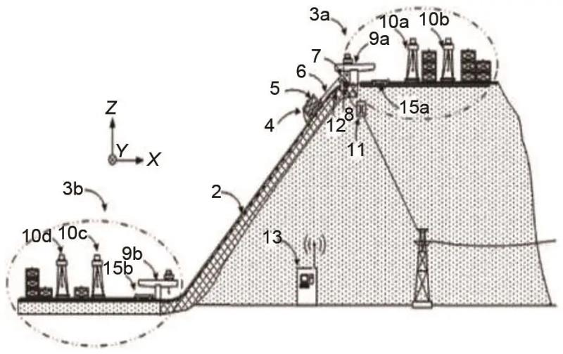 2014年天津大學(xué)提出利用斜坡軌道和碼垛機進行重力勢能儲能的構(gòu)想(圖10),使用絞盤拖拉纜繩帶動拖車,并使用電動發(fā)電一體機提高整體儲能效率。中科院電工研究所2017年提出了兩種重載車輛爬坡儲能方案(圖11),一種是采用永磁直線同步電機輪軌支撐結(jié)構(gòu),電動發(fā)電都通過直線電機完成;一種是利用多個電動絞盤拉拽車輛,分段儲能。中電普瑞電力工程有限公司2020年提出利用傳送鏈提升重物的方案,減少了能量的中間變換環(huán)節(jié),可長時間連續(xù)工作。利用山體落差進行儲能結(jié)構(gòu)穩(wěn)定,沒有倒塌風(fēng)險,可以實現(xiàn)更大規(guī)模的重力儲能。