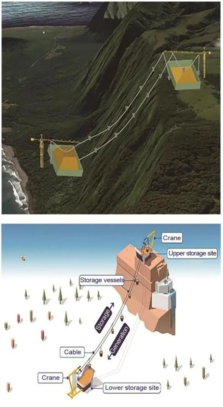 奧地利IIASA研究所2019年在Energy雜志上發(fā)表了一種山地纜繩索道結(jié)構(gòu)(圖9),纜繩吊起吊落重物進行儲能和釋能。該儲能系統(tǒng)MGES(mountain gravity energy storage)由兩個平臺連接而成,每一個平臺都由一個類似礦山的砂礫儲存站和一個正下方的加砂站組成。閥門將沙石填放入筐內(nèi),然后通過起重機和電機電纜將其運送到高海拔平臺。當(dāng)沙石被運回山下時,儲存的重力勢能被轉(zhuǎn)化為電能。與抽水蓄能電站等傳統(tǒng)的長期蓄水方法相比,MGES對環(huán)境的影響很小。該系統(tǒng)儲能容量設(shè)計為0.5~20 MWh,發(fā)電功率500~5000 kW,儲能平準化成本約為0.323~0.647元/kWh。這種儲能系統(tǒng)利用了天然山坡、使用砂礫作為儲能介質(zhì)可以減少建造成本,但纜車運載能力較低,室外環(huán)境對纜車運行影響較大,如何實現(xiàn)穩(wěn)定高效率的能量回收是此系統(tǒng)的研究難點。