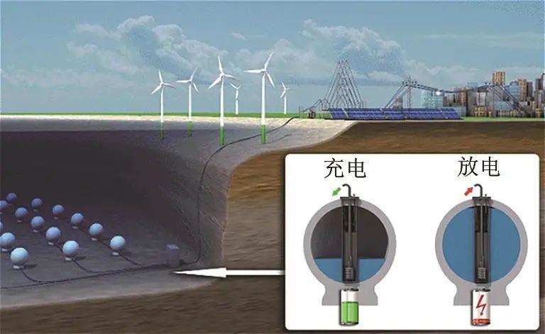 海下儲能系統(tǒng)由德國法蘭克福歌德大學(xué)教授Horst Schmidt-B?cking和薩爾布呂肯大學(xué)Gerhard Luther博士于2011年提出,形似海底“巨蛋”,利用海水靜壓差通過水泵-水輪機進行儲能和釋能,德國Fraunhofer風(fēng)能和能源系統(tǒng)技術(shù)研究所(IWES)2016年在博登湖進行了水上測試。這種稱為StEnSea的結(jié)構(gòu)(圖2)使用多個直徑30 m、壁厚2.7 m的中空球體,存儲容量可達12000 m3。據(jù)報道這些“海蛋”儲能容量為20 MWh,功率為5~6 MW,效率為65%~70%。該項目負責(zé)人表示通過全球探測,適合建造該系統(tǒng)的總儲能規(guī)模有8170億千瓦時。這種儲能結(jié)構(gòu)可以合理利用海洋空間,適合沿海地區(qū)的大規(guī)模儲能,利于海上風(fēng)電、潮汐能的消納利用,但中空球體的制造、海底系統(tǒng)的加固以及與海面溝通的電纜和管道的架設(shè)問題都亟待解決。