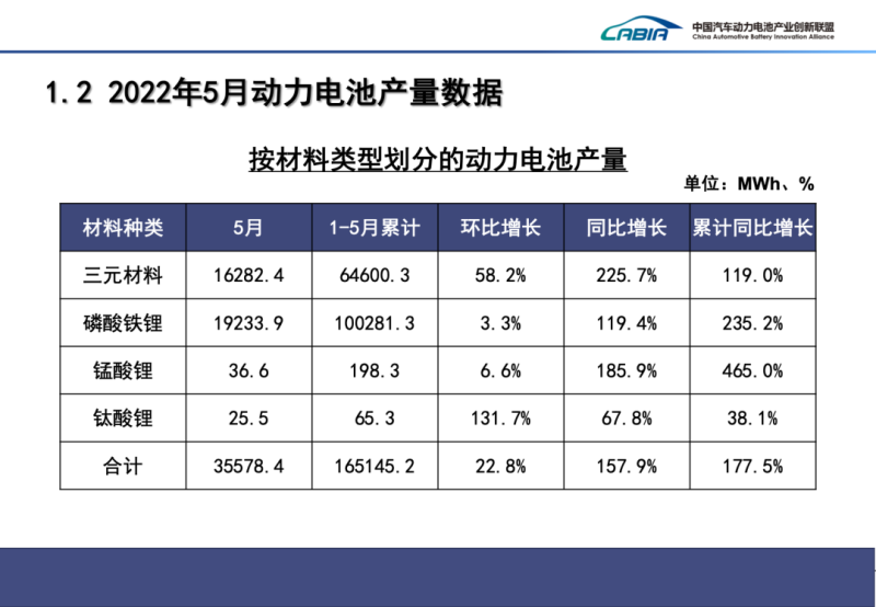 產(chǎn)量方面:2022年5月,我國動力電池產(chǎn)量共計35.6GWh,同比增長157.9%,環(huán)比增長22.8%。其中三元電池產(chǎn)量16.3GWh,占總產(chǎn)量45.8%,同比增長225.7%,環(huán)比增長58.2%;磷酸鐵鋰電池產(chǎn)量19.2GWh,占總產(chǎn)量54.1%,同比增長119.4%,環(huán)比增長3.3%。2022年1-5月,我國動力電池累計產(chǎn)量165.1GWh,累計同比增長177.5%。其中三元電池累計產(chǎn)量64.6GWh,占總產(chǎn)量39.1%,累計同比增長119.0%;磷酸鐵鋰電池累計產(chǎn)量100.3GWh,占總產(chǎn)量60.7%,累計同比增長235.2%。