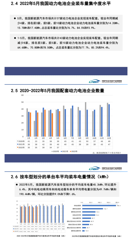 2022年5月,我國新能源汽車市場共計37家動力電池企業(yè)實現(xiàn)裝車配套,較去年同期減少4家。排名前3家、前5家、前10家動力電池企業(yè)動力電池裝車量分別為14.2GWh、15.7GWh和17.4GWh,占總裝車量比分別為76.7%、84.5%和93.9%。2022年1-5月,我國新能源汽車市場共計43家動力電池企業(yè)實現(xiàn)裝車配套,較去年同期減少8家,排名前3家、前5家、前10家動力電池企業(yè)動力電池裝車量分別為64.6GWh、70.8GWh和78.5GWh,占總裝車量比分別為77.7%、85.2%和94.4%。