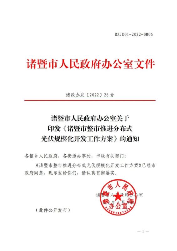 中國儲(chǔ)能網(wǎng)訊:6月10日,浙江省諸暨市人民政府辦公室發(fā)布關(guān)于印發(fā)《諸暨市整市推進(jìn)分布式光伏規(guī)?;_發(fā)工作方案》的通知。