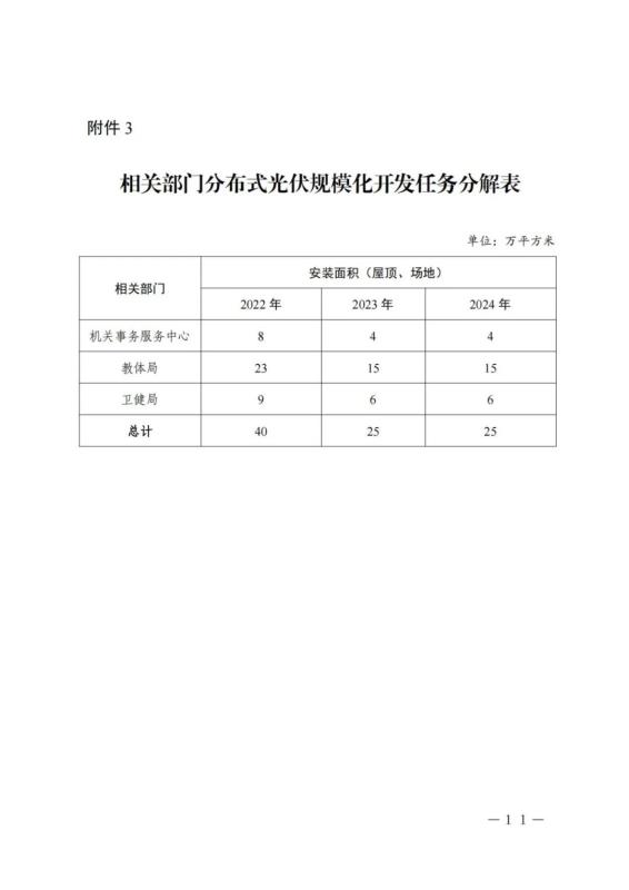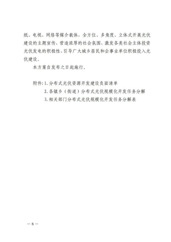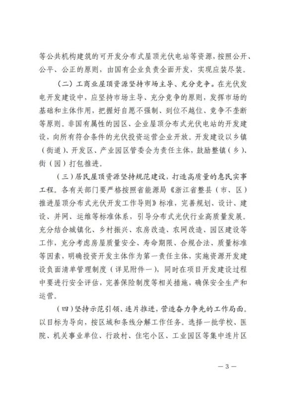 (二)城區(qū)屋頂光伏發(fā)展工程。黨政機(jī)關(guān)、車站、學(xué)校、醫(yī)院等公共建筑以及市屬國有企業(yè)可利用的屋頂實(shí)現(xiàn)應(yīng)裝盡裝,推動(dòng)城市連片商品住宅小區(qū)、拆遷安置住宅小區(qū)、商業(yè)建筑建設(shè)屋頂光伏發(fā)電系統(tǒng)。工商業(yè)建筑、特色小鎮(zhèn)、開發(fā)區(qū)(園區(qū))、自來水廠(開放性凈水池除外)、污水處理廠,按國家、省要求積極推進(jìn)。新建工商業(yè)屋頂、新建民用建筑、新建(改建)大型停車場(chǎng)地等公共基礎(chǔ)設(shè)施統(tǒng)籌規(guī)劃、積極推進(jìn)。