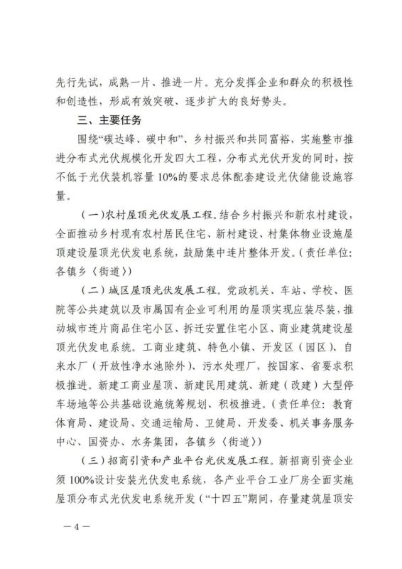 通知明確,圍繞“碳達(dá)峰、碳中和”、鄉(xiāng)村振興和共同富裕,實(shí)施整市推進(jìn)分布式光伏規(guī)?;_發(fā)四大工程,分布式光伏開發(fā)的同時(shí),按不低于光伏裝機(jī)容量10%的要求總體配套建設(shè)光伏儲(chǔ)能設(shè)施容量。