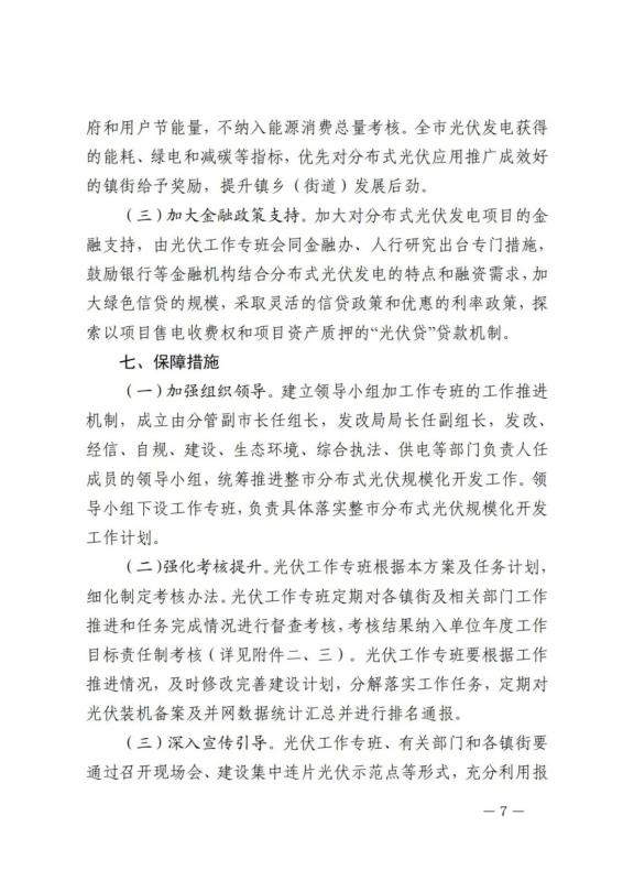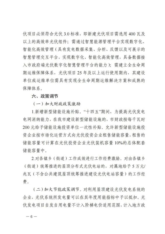 加大節(jié)能政策調(diào)節(jié)。對(duì)利用屋頂建設(shè)光伏發(fā)電系統(tǒng)的企業(yè),光伏系統(tǒng)所發(fā)電量可以在其年度用能指標(biāo)中予以抵扣。光伏發(fā)電項(xiàng)目自發(fā)自用電量不計(jì)入階梯電價(jià)適用范圍,計(jì)入地方政府和用戶節(jié)能量,不納入能源消費(fèi)總量考核。全市光伏發(fā)電獲得的能耗、綠電和減碳等指標(biāo),優(yōu)先對(duì)分布式光伏應(yīng)用推廣成效好的鎮(zhèn)街給予獎(jiǎng)勵(lì),提升鎮(zhèn)鄉(xiāng)(街道)發(fā)展后勁。