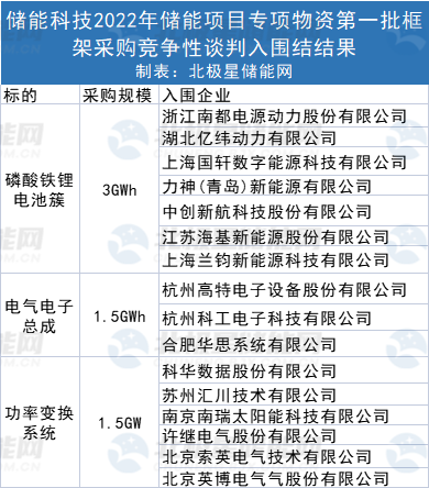 公告顯示,3GWh磷酸鐵鋰電池簇入圍供應(yīng)商包含南都、億緯、國(guó)軒、力神、中創(chuàng)新航、?;?、上海蘭鈞等7家企業(yè),1.5GWh電氣電子總成入圍供應(yīng)商包含高特、杭州科工、合肥華思等3家企業(yè),1.5GW功率變換系統(tǒng)入圍供應(yīng)商包含科華、匯川、南瑞、許繼、索英、英博等6家企業(yè)。